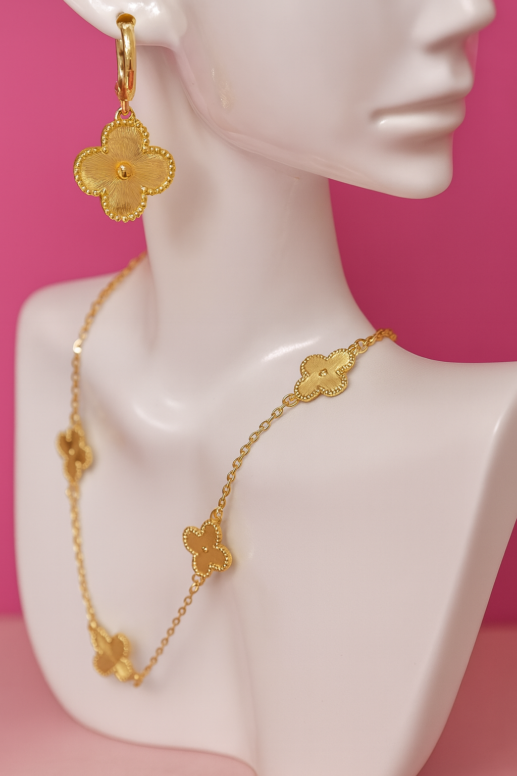 Step into timeless sophistication with the Golden Clover Elegance Set. Featuring a delicately crafted necklace and matching drop earrings, each clover design symbolizes luck, harmony, and grace. The radiant gold finish catches the light with every movement, creating a glow that enhances your natural beauty.