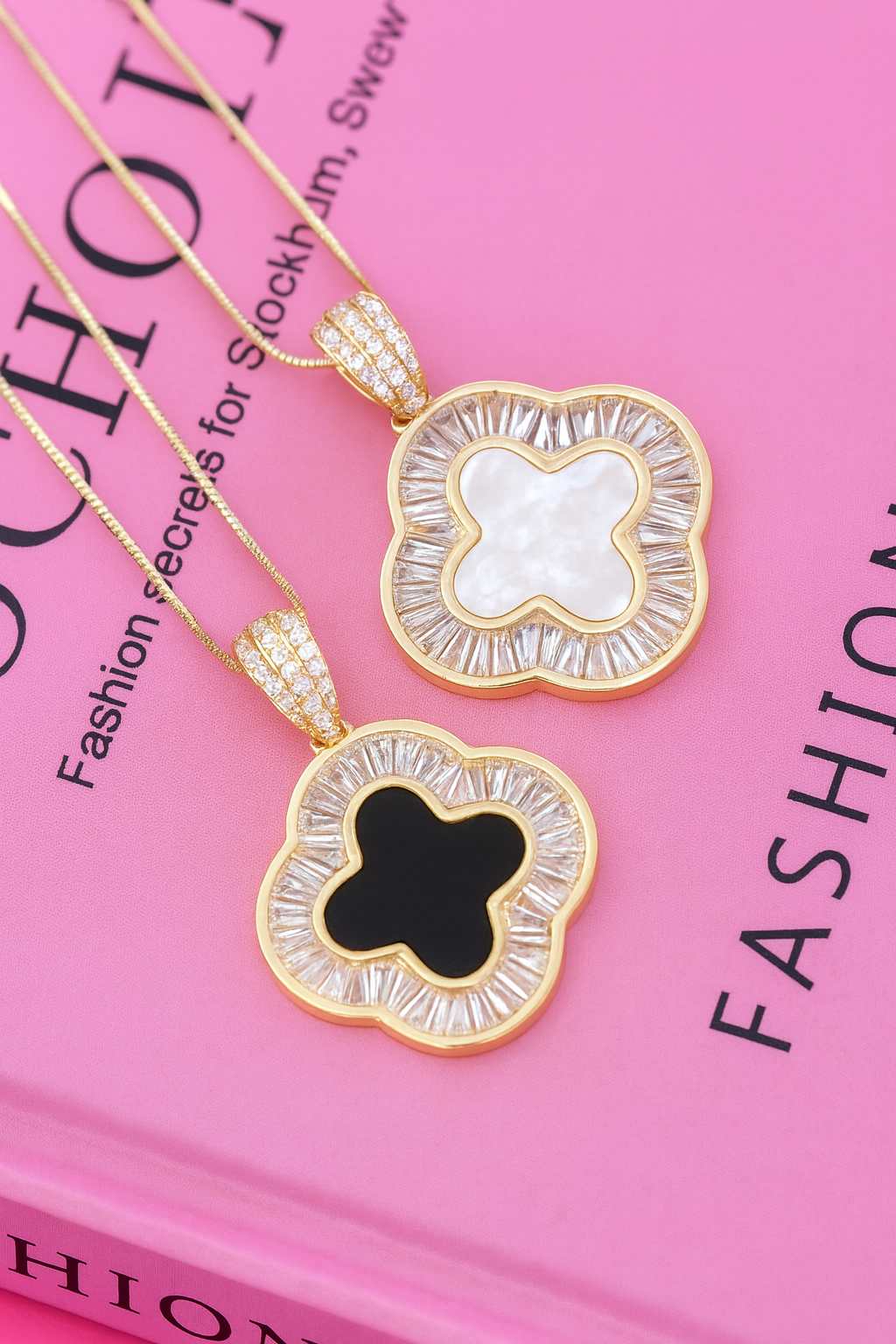 The Luxe Clover Radiance Pendant is where timeless elegance meets modern sophistication. Featuring a striking clover design framed in a radiant halo of baguette-cut stones, this pendant is available in two classic finishes: bold black for confidence and allure, and luminous white for purity and grace.